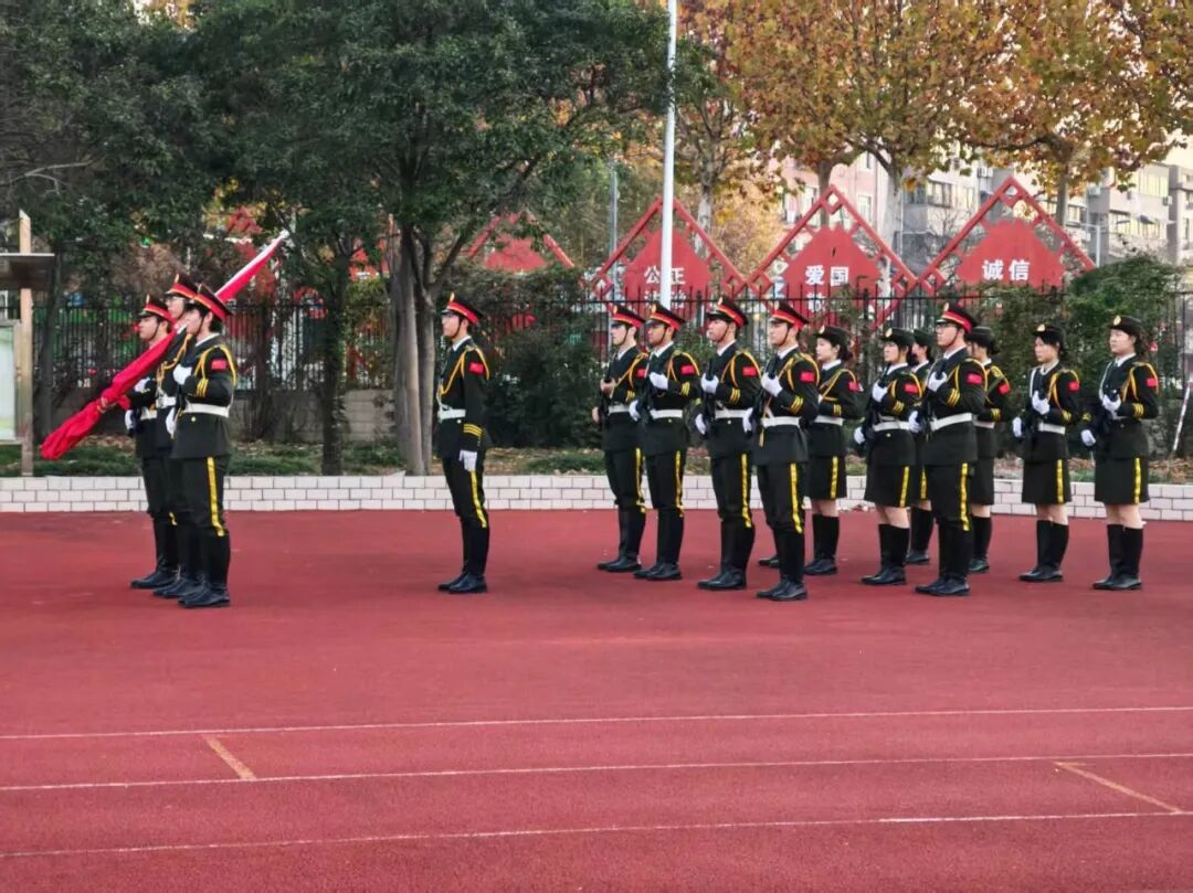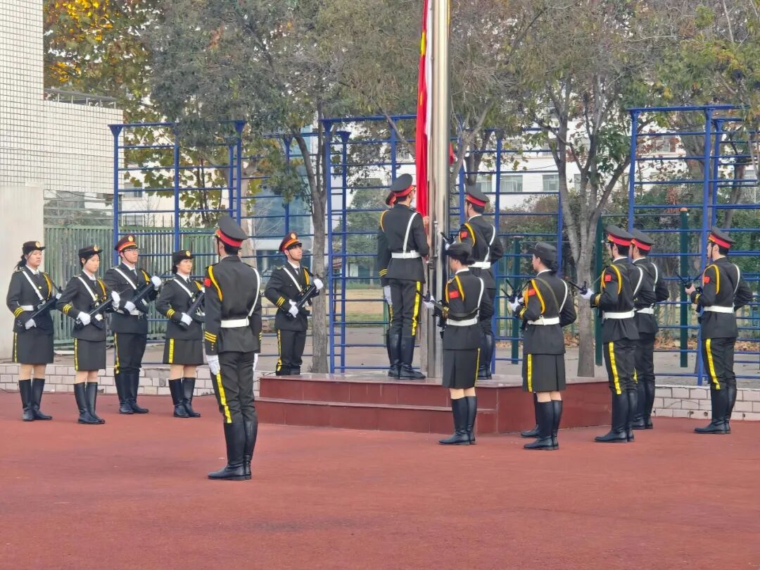 国旗护卫队身姿挺拔,以整齐划一的姿态,庄重地护送着那面鲜艳夺目的五星红旗迈向升旗台。当激昂嘹亮的国歌声奏响,五星红旗在晨风中缓缓升起,全体师生神情肃穆,面向国旗行注目礼,齐声高唱国歌。